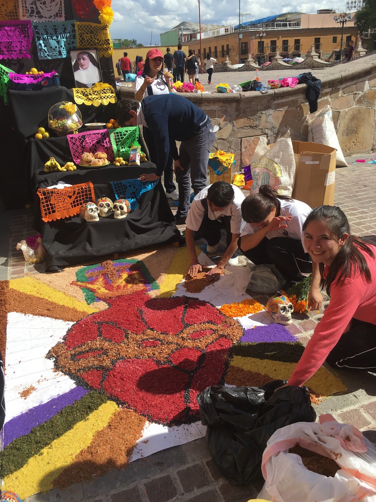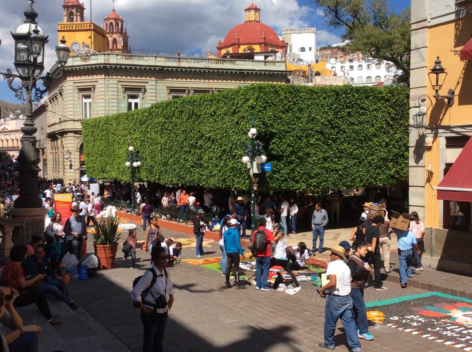 Guanajuato's central plaza - called the "Jardin" - is full of art, restaurants and narrow streets. Notice the student groups constructing "Dia de los Muertos" street art as part of a local competition. |