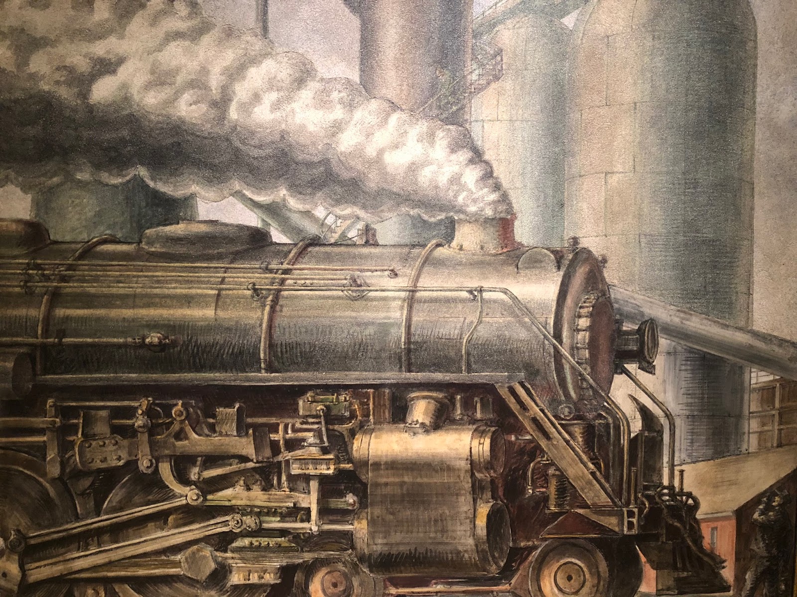 Reginald Marsh's The Locomotive (1935) is a fitting painting for the former estate of a railroad tycoon and collector. In the 1930s, much American art idolized transportation and progress. |