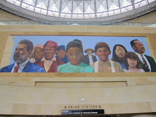 We boarded at the Irvine Station and were at Union Station in a little over an hour. The new lobby of LA's Redline Subway is quite attractive with a huge mural and a huge, domed decorative skylight.