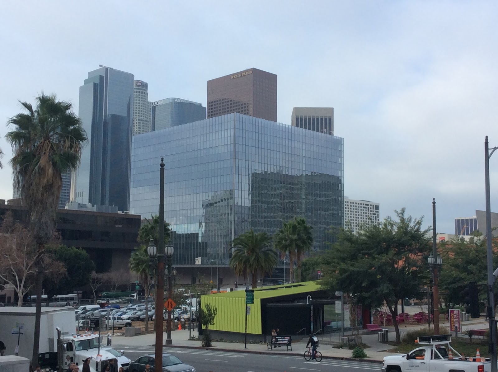 We headed east towards City Hall and visited downtown's newest building - the federal District Court Building. This 10-story floating cube at first turned me off, but I have begun to like the pleated-tempered glass surface and the way the structure sits on a stone podium allowing for a more inviting pedestrian connection between the building and the adjacent Grand Park. The new generation of skyscrapers are using a more-translucent glass which softens their visual impact on the skyline. The lobby of the courthouse is elegant and cold, but the floor-to-ceiling atrium is impressive indeed.