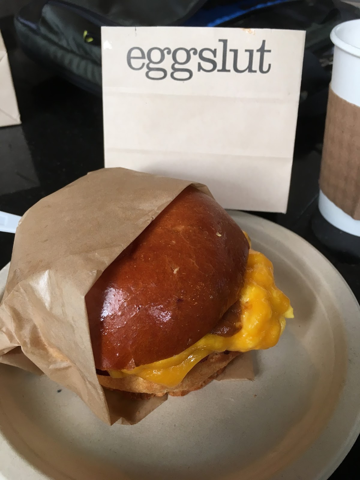 The Fairfax features scrambled eggs, cheddar cheese, carmelized onions and bacon on a soft brioche roll. Yum!